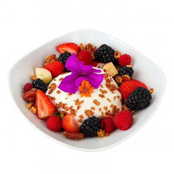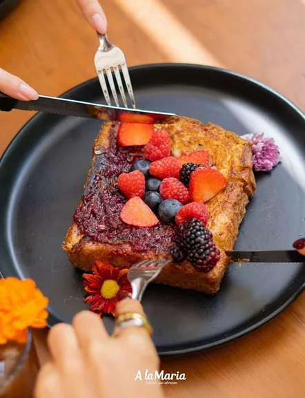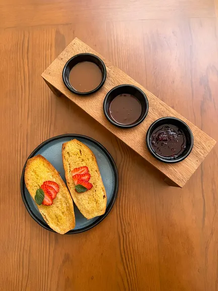 Pan brioche con un toque de canela y azúcar, acompañado de una compota de frutos rojos y fruta fresca