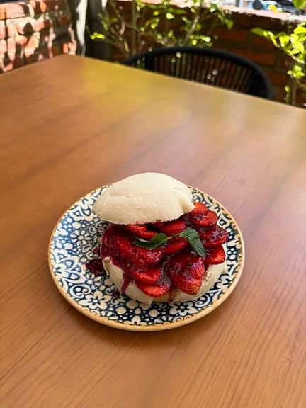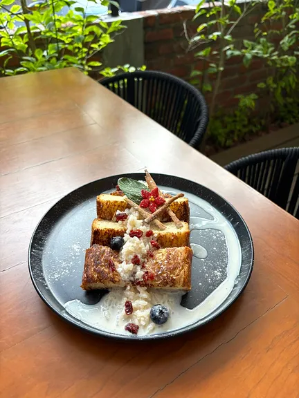 Especial de temporada. Simplemente delicioso. Pan brioche bañado en arroz con leche, con trozos de arándano y nuez encima