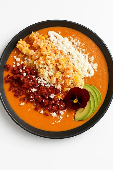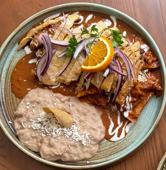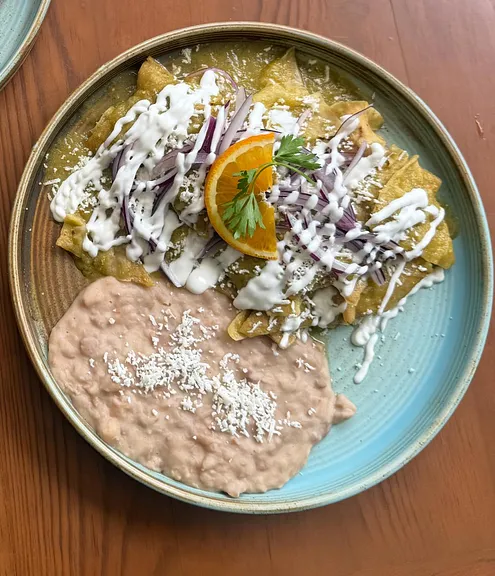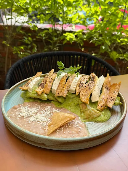 Totopos crujientes, en una salsa suave de chile poblano y crema, con el balance perfecto entre sabor y suavidad, coronados con panela, pollo y rajas