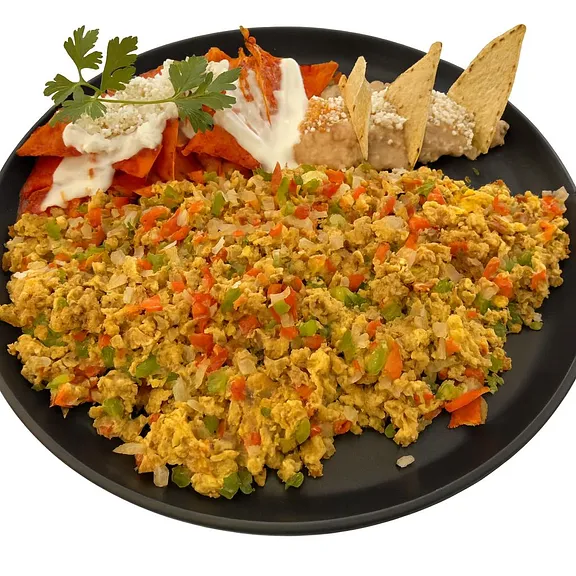 Huevos revueltos con machaca, cebolla y chile morrón.