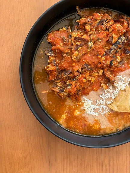 Totopos caseros, bañados en salsa roja de la casa, servidos con queso, crema y cebolla.