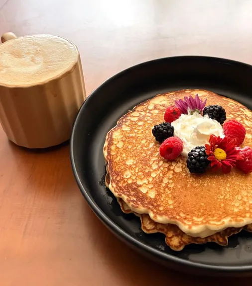 Esponjosos y calientitos, acompañados de mantequilla, miel maple, fruta fresca y un toque de crema batida, un clásico que siempre reconforta