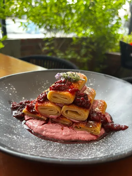 Rollitos de crepa montados sobre una deliciosa cama de Philadelphia y mermelada de frutos rojos, espolvoreada con azúcar glass