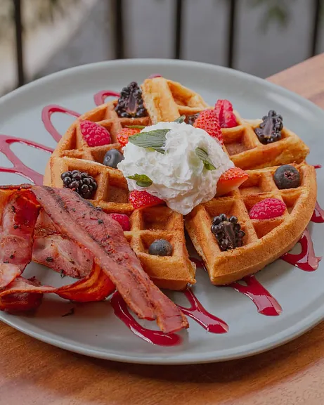 Con crema chantilly, tocino y frutos rojos