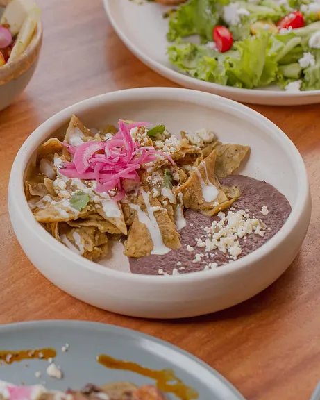 Totopos de tortilla orgánica con la tradicional salsa roja de chilaquiles, frijoles negros, crema, queso cotija, cebolla morada y cilantro