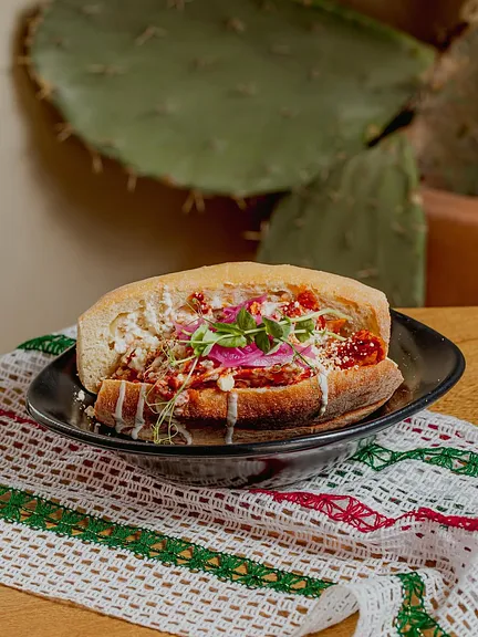 Bolillo con chilaquiles refritos negros, chilaquiles rojos, chami jalapeños, servido con crema y queso cotija