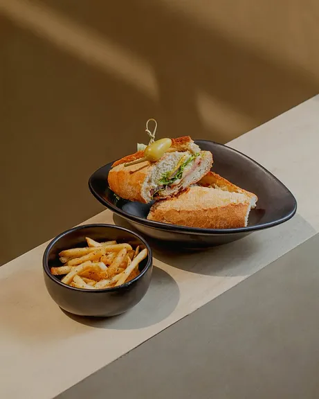 Pan brioche con jamón de pavo, queso manchuella y aderezo chipotle, melón y de huevo coronado con un huevecito