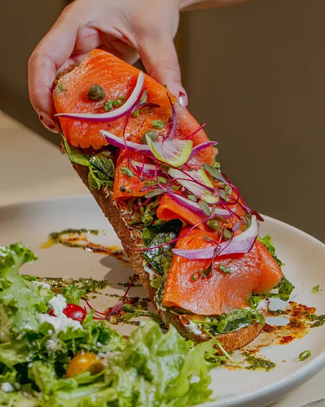 80 gr de salmón ahumado con queso crema, cebollín, alcaparra y arúgula