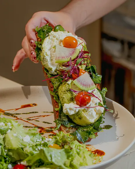 Aguacate, sal, tomate seco, aceituna negra, aceite de olivo