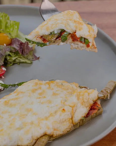De queso a la plancha con champiñones 110 / Con Chorizo 120