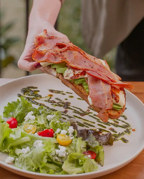 Panela asada, tocino y abanico de aguacate