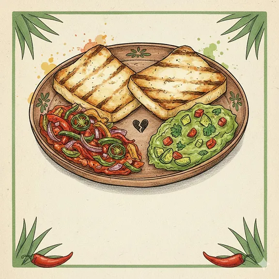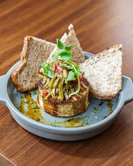 Panela asada acompañada de nopales a la mexicana y pan de masa madre