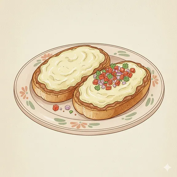 Bolillo a la plancha, frijoles refritos negros y queso rayado gratinado