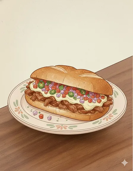 Lonche a la plancha relleno de birria 80g, queso gratinado, cebolla, cilantro fresco y consommé