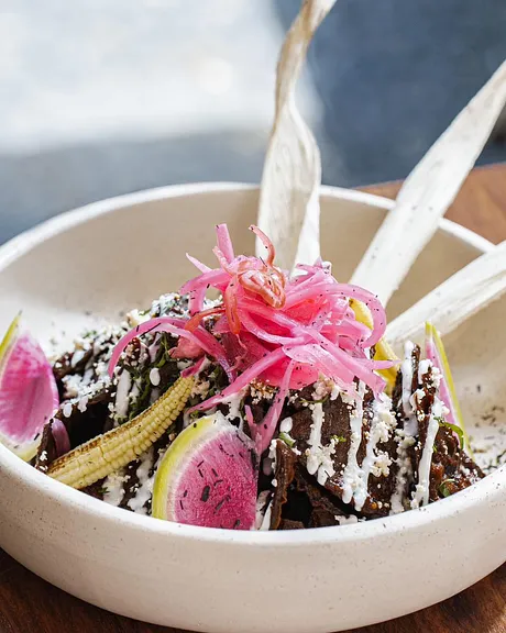 Totopos orgánicos, bañados en salsa negra hecha a base de chiles tatemados con toque de cebolla morada, crema, queso cotija y cilantro