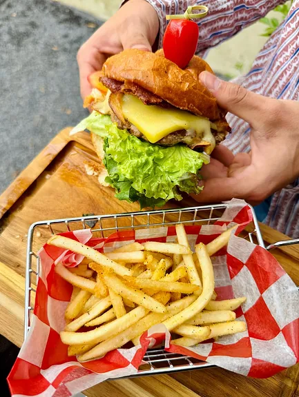 Hamburguesa clásica de res, 125 gr carne 90% res con pan brioche biendorado, queso gouda, mayonesa, lechuga, jitomate y aguacate, acompañada de papas francesas