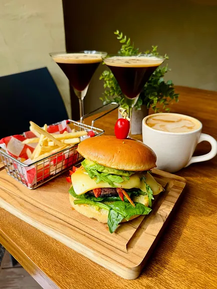 Hamburguesa de quinoa, garbanzos, zanahoria, calabacitas salteadas a la mantequilla, pan brioche con queso gouda,lechuga, jitomate y aguacate con papas de cilantro, acompañada de papas fritas caseras