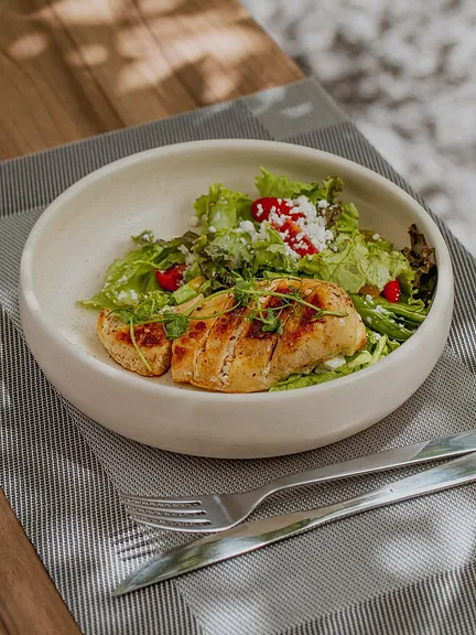 200 gr Pechuga de pollo a la plancha bañada en una cremosa salsa de champiñones acompañada de verduras baby