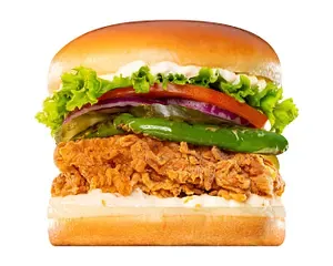 Hamburguesa de pollo crispy, lechuga fresca, jitomate, cebolla, pepinillos y un toque de aderezo con salsa Búffalo.