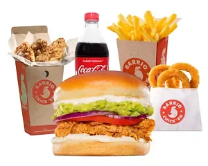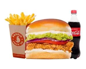 Hamburguesa de pollo crispy, lechuga fresca, jitomate, cebolla, pepinillos y un toque de aderezo con salsa Buffalo + papas fritas y refresco.