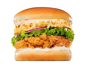Hamburguesa De Pollo Con Cebolla Morada, Lechuga, Coleslaw, Pepinillo y Mostaza Dulce.