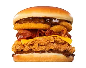 Hamburguesa De Pollo Con Onion Rings, BBK, Queso Cheddar y Tocino.