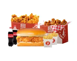 El combo incluye una CheeseBurger, 4 tenders, 4 boneless, 2 papas regulares y 2 refrescos a elegir.