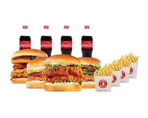 El combo incluye: 4 hamburguesas a elegir, 4 papas regulares y 4 refrescos a elegir.