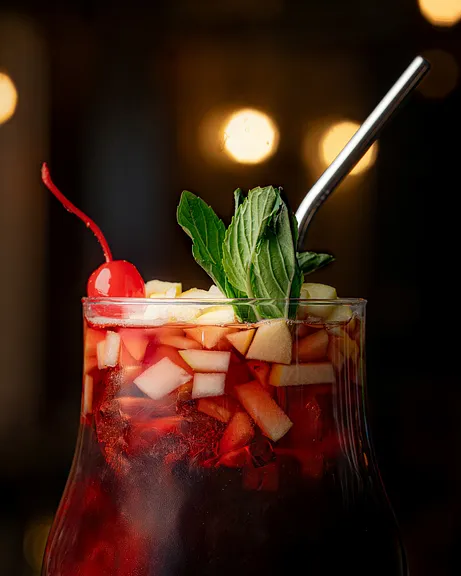 Delicioso coctel a base de vino tinto pinto con fruta de temporada