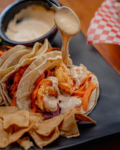 Taco de camarón rebozado, acompañado con zanahoria y col morada, acompañado con una salsa marinera