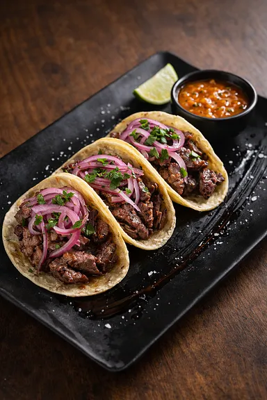 Carne calidad premium en tortilla de maíz acompañada de cebolla morada y camote tricolor, rib eye new york cecina suave