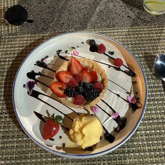Servido con frutos rojos, jugo de agave y ganaché blanco.