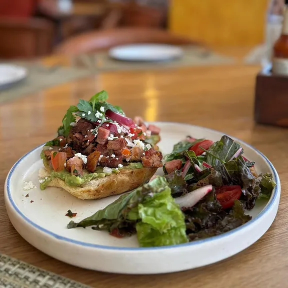 Pan dorado con requesón, guacamole, jitomate cherry y pancita de cerdo (220 g)