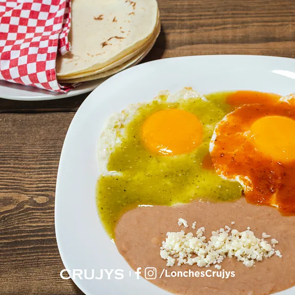 2 huevos estrellados bañados con salsa roja y verde, incluyen frijoles fritos, tortilla o bolillo y salsa de tomate para acompañar