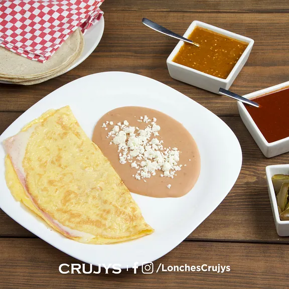 Puedes elegir: queso, pimienta, jamón, tocino, champiñones, elige 2 a la mexicana, incluyen frijoles fritos, tortilla o bolillo y salsa de tomate para acompañar