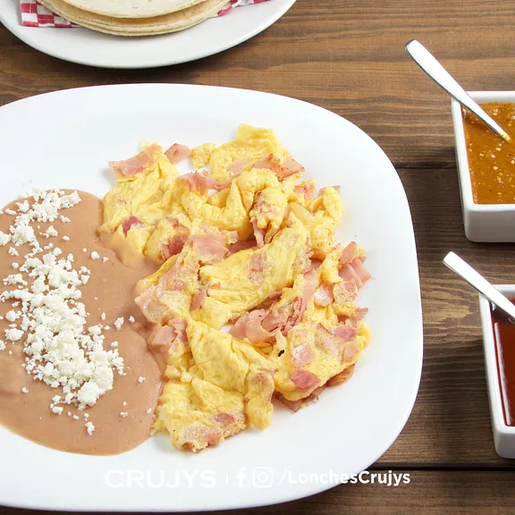 2 huevos con jamón, incluyen frijoles fritos, tortilla o bolillo y salsa de tomate para acompañar