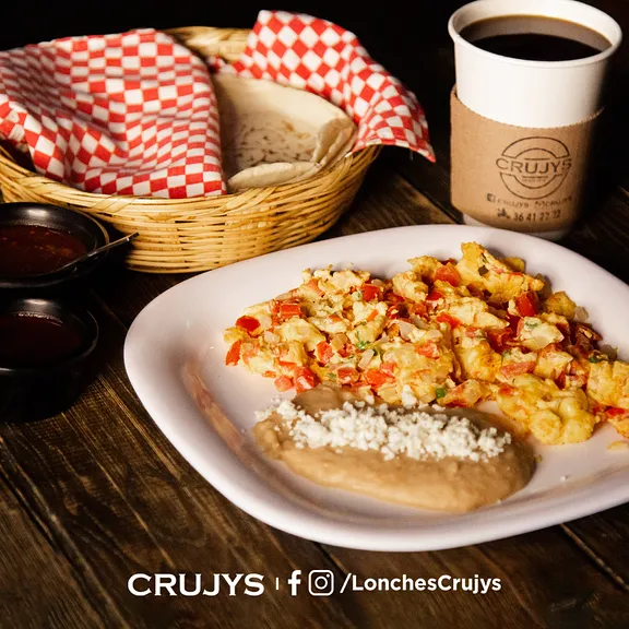 Huevo revuelto, bañado en salsa roja, incluyen frijoles fritos, tortilla o bolillo y salsa de tomate para acompañar