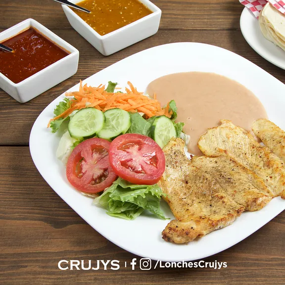Pechuga de pollo a la plancha, acompañada ensalada, frijoles fritos y tortillas para acompañar