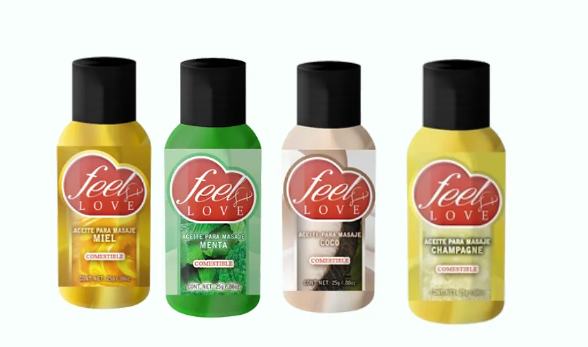 Aceite térmico comestible disponible en sabores: Coco, Menta, Miel y Champagne. Presentación de 25ml.