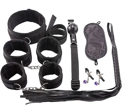 Bola de boca hueca. 2 Esposas. 1 Látigo. 2 Pinzas para pezones. 1 Antifaz. 1 Collarin. Hecho de vinil y felpa.