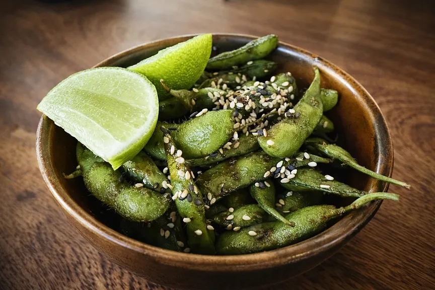 Vainas fritas de soya al vapor, servido con sal tercias de limón.