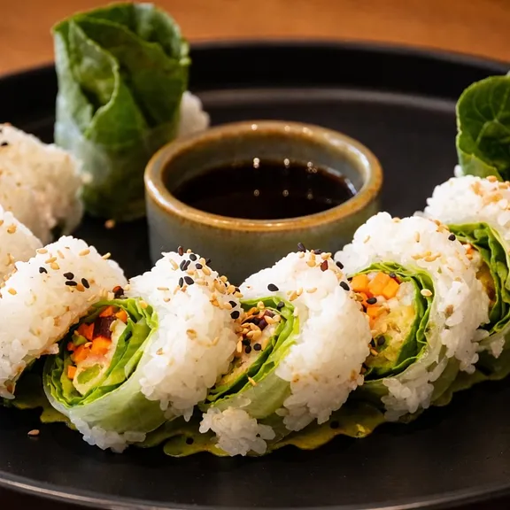 Hoja de lechuga, pepino, aguacate, zanahoria, betabel y espárrago tempura envuelto en Papel de arroz, coronado con poco de arroz y un hilo de salsa de cilantro.