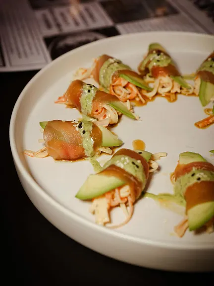 Spicy kanikama y rebanadas rebanadas de aguacate envuelto en finas cortes de pescado, bañado con aderezo de cilantro y salsa serrano