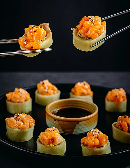 Atún spicy kanikama, aguacate y espárrago tempura envuelto en hoja de pepino topping de salmón spicy.