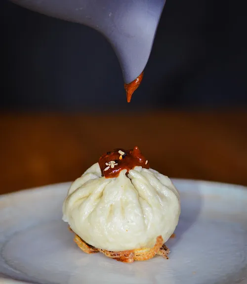 Delicioso panecillo de harina de trigo cocido a vapor, servido con pollo coreano picante