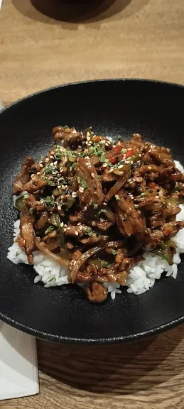 Tiras de res salteadas al wok, pimientos, salsa oscura preparada con crema de cacahuate y nuestro chili oil casero con chapulines · servido con arroz al vapor un toque de ajo tostado