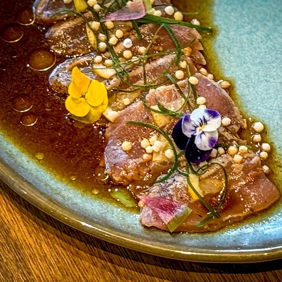Cono delgado de atún sellado black and white servido con finas láminas de limón real,ajo tostado, salsa serrantos y un hilo de aceite de curry