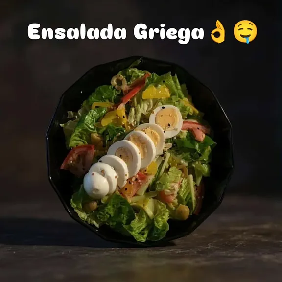 Fresca combinación de tomate, lechuga y pepino con toque de albahaca, cebolla morada, pimiento y aceitunas