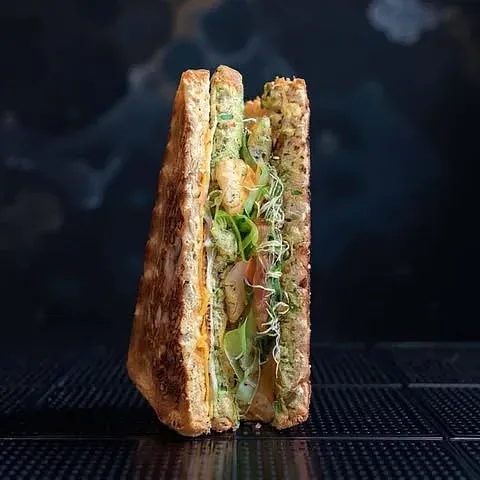 Pollo a la plancha, queso panela, lechuga, láminas de aguacate, tomate y ajonjolí marinado