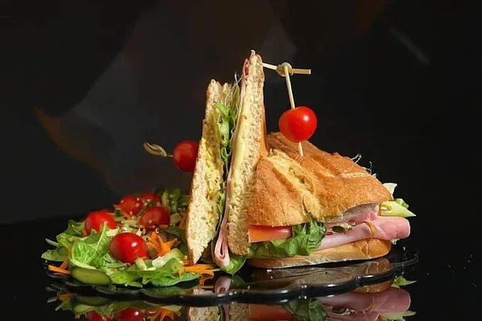 Jamón, queso suizo, tomate, pepino, un toque de germinado y aderezo de la casa